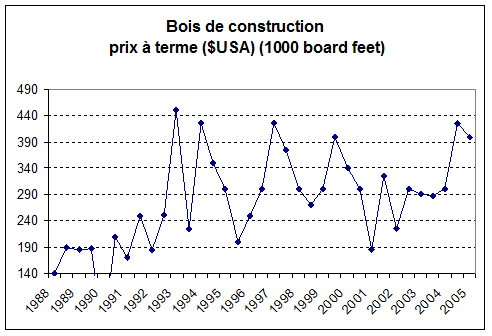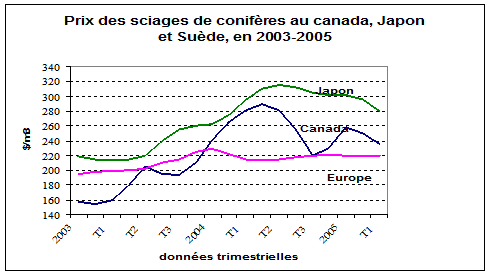 Source : à partir de UNECE En 2005, les importations de sciages tempérés ont augmenté de 3,22% en Europe alors qu’elles se sont stabilisées en Amérique du Nord pour un rebond attendu en 2006 aux alentours de 2,2%. L’Amérique du Nord est devenue pour la première fois un importateur net en 2004 et devrait le rester en 2005 et 2006. Pour la première fois depuis 1998, les exportations de sciages résineux d’origine russe pourraient ne pas augmenter en 2006, compte tenu du renforcement prévu de la consommation intérieure. En Europe, la dépendance à l’importation se stabiliserait autour de 39% alors que celle à l’exportation serait en réduction. Pour l’Amérique du Nord la dépendance à l’importation déjà inférieure à celle de l’Europe, se stabiliserait tout comme celle à l’exportation. Les développements sur le marché du sciage ont été directement liés à l’activité dans la construction aussi bien en Europe, au Japon et en Amérique du Nord. Les prix élevés en dollar dus à une activité de construction record aux Etats-Unis et une forte demande de bois sciés ont conduit les pays européens à accroître entre 2003 et 2004 leurs exportations au Japon de 9% et aux Etats-Unis de 50% en dépit de la surévaluation de l’Euro par rapport au dollar. Ainsi, la Finlande a accru ses exportations de sciages vers le japon de 14% et l’Allemagne et l’Autriche ont accru les leurs vers les Etats-Unis respectivement de 63,4% et 50,7% pour des volumes respectifs de 1,1millions de m3 et 0,6 millions de m3. Contrairement à l'Europe où les prix, après une légère croissance en 2003 sont resté atones, en Amérique du Nord et au Japon tous les prix sont allés crescendo dès 2003 avant d'amorcer une tendance à la baisse dans la deuxième moitié de 2004.