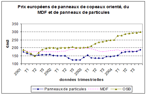 Source : à partir de Wood Market Monthly, 2005 En ce qui concerne les marchés des panneaux à base de bois, la vigueur des marchés constatée en 2003 s’est poursuivie en 2004, mais s’est affaiblie en 2005. En France, par rapport à 2003, on note une croissance dans la production des panneaux de particules de 9,6%, la plus importante croissance pour 2004 en Europe de l’Ouest. En même temps la croissance de la consommation intérieure a été soutenue avec une augmentation de 14%.. La dynamique du marché intérieure s’est aussi retrouvée à l’exportation et sur le plan européen. Entre 2004 et 2005, la demande des importations européennes s’est accrue de 2,37% et l’offre d’exportation de 1,84%, mais la tendance est à l’essoufflement pour 2006. En effet, les coûts de production se sont inscrits en hausse dans le sillage des niveaux records atteints par les cours pétroliers qui ont renchérit les coûts afférents à la production, à l’énergie, aux résines et colles et aux transports. La même tendance a été observée au niveau des panneaux de fibre, en particulier à l’export, la vigueur du marché du MDF devrait se maintenir en 2005 par rapport à 2004 avec un accroissement de 4,56% des volumes exportés. Pour le panneau OSB l’industrie européenne a enregistré d’importants taux de croissance de la production. La France deuxième producteur européen a connu en 2004 une croissance de la production de 31% par rapport à 2003. Un des éléments frappant est l’augmentation des exportations européennes de l’OSB en Amérique du Nord. Graphique 3.