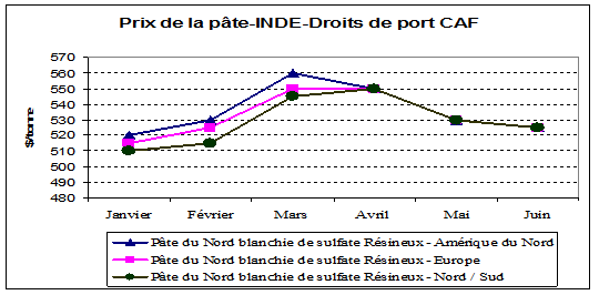 Le marché nord américain de panneaux a répondu à la demande du marché de construction mais sa vigueur a été plus importante en ce qui concerne les panneaux de fibres. En effet l’augmentation de la consommation de 9,85% de panneaux de fibre durs a entraîne une hausse des importations de 10,63% entre 2004 et 2005. Cette vigueur devrait néanmoins s’affaiblir en 2006. De même, le marché de la fédération de Russie a été dynamique au niveau des panneaux de fibre en particulier le MDF. En 2005, on estime que la consommation a bondit de 32,53% par rapport à 2004, entraînant une demande d’importation en hausse de 3,13%. Le potentiel de demande du MDF estimée en Russie se trouve entre 600 mille et 700 mille m3 et ce n’est qu’à la fin 2006 que l’industrie russe pourrait produire un volume d’environ 960 mille m3. A propos de papier, cartons le marché mondial a connu à partir de 2003 une augmentation régulière de la demande mondiale. Les expéditions des pays exportateurs européens vers les marchés asiatiques représentaient 38% des exportations en 2003. Ce dynamisme s’est poursuivit en 2004 et 2005 mais a eu tendance à s’infléchir dans la deuxième moitié de 2005. Dans la région UNECE le taux de croissance annuel de la consommation de papier et cartons a été de 1,38% entre 2004 et 2005. La surévaluation de l’Euro face au dollar a limité l’appréciation des prix en Europe où la production et l’exportation, en raison du lock-out en Finlande qui a interrompu la production pendant plusieurs semaines, ont reculé entre 2004 et 2005 à la fois pour les papiers et carton et pour les pâtes. Une amélioration de la situation est attendue pour 2006. Sur le marché nord américain la production de papier et carton a augmenté de 3,3% en 2004 pour atteindre 104,2 millions de tonnes alors que la consommation apparente avait augmenté de 4,5% à 101,1 millions de tonnes. Un ralentissement de cette tendance apparaît en 2005 et même un recul de –2,2% des exportations. A cette déclinaison correspond une hausse des importations en 2005 de 3%. Ces évolutions ont suivi la reprise économique aux Etats-Unis qui s’est conjuguée avec la dépréciation du dollar stimulant la profitabilité des industriels américains. Le Canada a aussi connu une augmentation de sa production de papier et carton en 2004 en rapport avec la reprise économique aux Etats-Unis. La surévaluation du dollar canadien par rapport au dollar américain a en revanche limité les performances de la production. S’agissant de la fédération de Russie, le marché du papier et carton apparaît atone au début de 2005. Alors que la croissance de la production et de la consommation était respectivement de 6,5% et 5,8% en 2004, l’année 2005 enregistrerait des taux de croissance respectifs de la production et de la consommation de 3,1% et 4,7%. En fait la production de papier et carton a connu un retard jusqu’en mai 2005, au final les exportations n’ont progressé que de 1,6%. Avec plus du tiers de la production exportée, le marché russe de papier et carton dépend à près de 52% du trend du marché mondial. Quant au marché des pâtes, le cours de la tonne des pâtes NBSK a avoisiné les 630 dollars au troisième trimestre de 2004 puis s’est établit à 580 dollars au début 2005. Cette évolution provient de la baisse de la demande chinoise et de l’atonie de la demande européenne. L’industrie des pâtes a connu en 2004 un climat morose avec notamment une baisse de la consommation de -0,09% dans la région UNECE, les effets de la lente reprise de la croissance économique mondiale étant contrebalancés par la valeur élevée de la monnaie européenne vis-à-vis du dollar. Ce qui a sérieusement limité les performances des exportations des pays de la zone Euro, en sus de l’influence négative des nouvelles capacités de pâtes marchandes arrivées sur le marché. À la fin 2004, le cours de la pâte de référence NBSK (Northen Bleached Softwood Kraft Pulp ) qui fléchissait a pu être relevé. Graphique 4