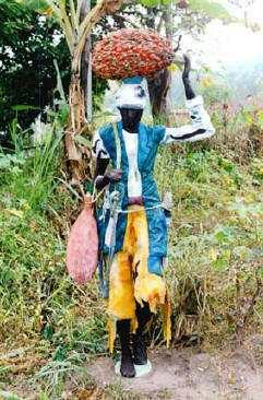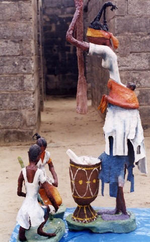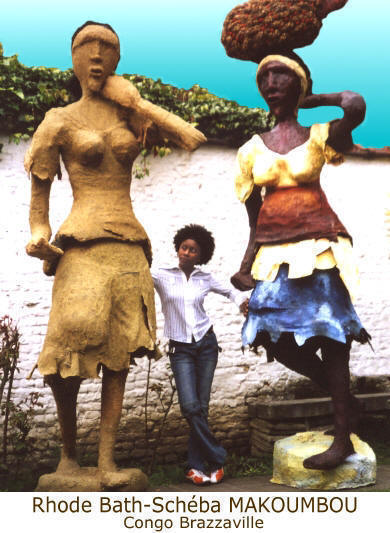 Rhode Bath-Schéba MAKOUMBOU :Ma démarche artistiqueNous sommes tous des Humains appartenant à la planète Terre, mais nous sommes tous conscients des différences qui existent entre nous. Les différences proviennent des conditions sociales, culturelles, religieuses et climatiques, entre autres, qui ont façonné notre longue histoire humaine. Il est intéressant de parler de l’identité culturelle de chacun d’entre nous. Pas en valeur d’opposition, mais comme une richesse du monde qui tire ses sources dans la diversité culturelle. Nous ne pouvons parler d’identité culturelle sans pour autant parler de diversité culturelle. Il faut toujours se battre pour protéger et renforcer ces notions idéologiques, surtout par rapport à des effets négatifs de la mondialisation qui tente d’uniformiser tous les codes humains. Pour ma part, j’ai choisi de représenter dans mon travail les activités quotidiennes en Afrique, surtout celles des femmes, comme expression particulière d’une des richesses de notre continent. Il faut toujours s’ouvrir aux autres et avoir des sources d’influence de ce qui se fait de plus intéressant et d’authentique dans le monde, mais en les intégrant dans la spécificité des traditions de nos peuples et des créateurs du passé. Les artistes africains s’intègreront à la mondialisation en essayant d’élargir leur technique à partir de leurs propres racines culturelles. Mon but est de partir des codes des traditions qui m’ont entourées depuis ma naissance pour mettre en valeur le travail, la vie de tous les jours, mais aussi les joies et malheurs qui nous entourent quotidiennement. Je pense que c’est important d’être une ou un artiste témoin de son temps, en créant des œuvres qui tendent à la modernité tout en ne rejetant pas le passé, et également en revalorisant les valeurs du métier créatif. Rhode Bath-Schéba MAKOUMBOU Brazzaville, mai 2006 |