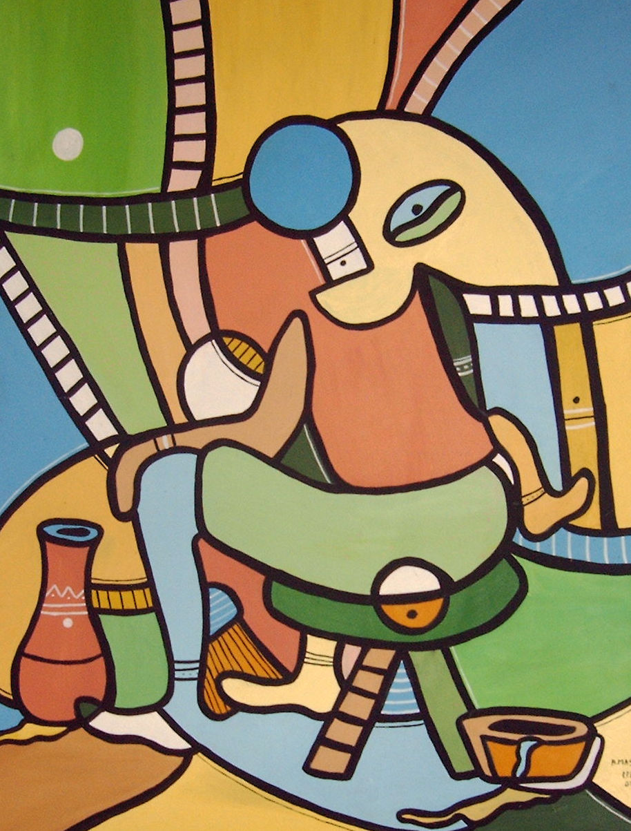 Artiste plasticien Eugène MALONGA est né le 28 janvier 1930 à Nko et décédé le 13 avril 2005. Il est considéré comme l'un des cinq fondateurs de la peinture congolaise, inexistante avant 1940. Son œuvre compte de nombreux paysages et quelques portraits; elle vacille entre le réalisme et la semi-abstraction. Ses motifs préférés sont les paysages et les scènes de genres, avec une évolution vers la semi-abstraction. Il utilise la peinture sur bois, l’aquarelle sur papier, et le dessin. D’un point de vue formel, l’œuvre de cet artiste éminent se caractérise par des empâtements, une exploration de la matière et de la texture ainsi que des couleurs vives et des lignes franches.
