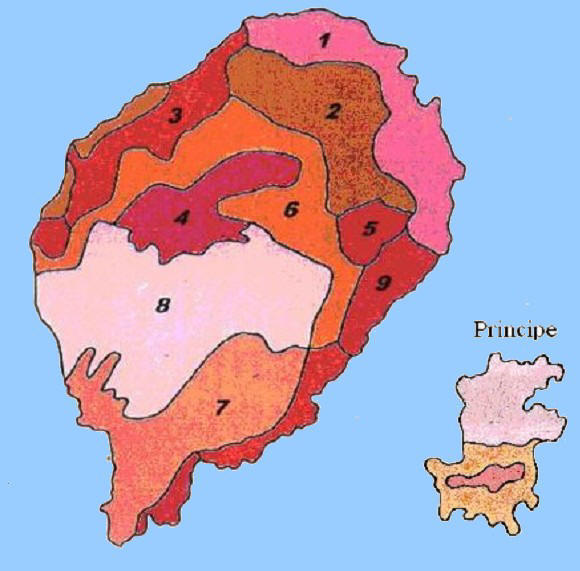 Depuis les années 50, les superficies consacrées au le cacao ont été réduites de plus de 80%. On rencontre dans l'archipel de nombreuses plantations abandonnées. Mais le cacao occupe encore 60% des terres cultivées. 5. Géologie, Pédologie, Répartition des terres Les sols prédominants sont d'origine basaltique, en général riches, créés par l’altération des cendres volcaniques et des rochers magmatiques. Ils présentent un pH proche du neutre, une bonne teneur en potassium et phosphore, une bonne capacité d'échange cationique et une bonne capacité de rétention d'eau. Très peu d'études pédologiques existent. Les plus récentes sont fragmentaires, ponctuels et limitées sur une poignée de zones. La seule étude, au niveau national, suivie d'une classification pédologique, date d'avant l'indépendance. Elle a été réalisée par en 1962 par J. Carvalho Cardoso et J. Sacadura Garcia. Selon cette étude, des huit grands types de sols identifiés, trois sont fondamentalement paraferralitiques: il s'agit des sols fersialitiques et des sols litoliques qui couvrent 75% de la surface du pays où l'on pratique l'agriculture. Les cinq grands types restant ont un revêtement réduit ou presque insignifiant au niveau national à savoir : boues noires, sols glei, regossoles, psamitiques, aluviossoles, sols de gouttes (Coluviossolles). Figure 3. Carte des sols de São Tomé & Príncipe