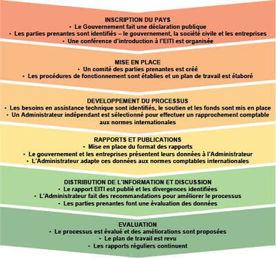 Sources : - EITI, Des informations à propos de EITI. L’initiative pour la transparence dans les industries d’extraction. - NOBILEAU-FORGET, (Élise), Initiative pour la Transparence des Industries extractives et le rôle de l'Investisseur Institutionnel, Montréal, Revenu Watch Institute, 30 mai 2007. | ||